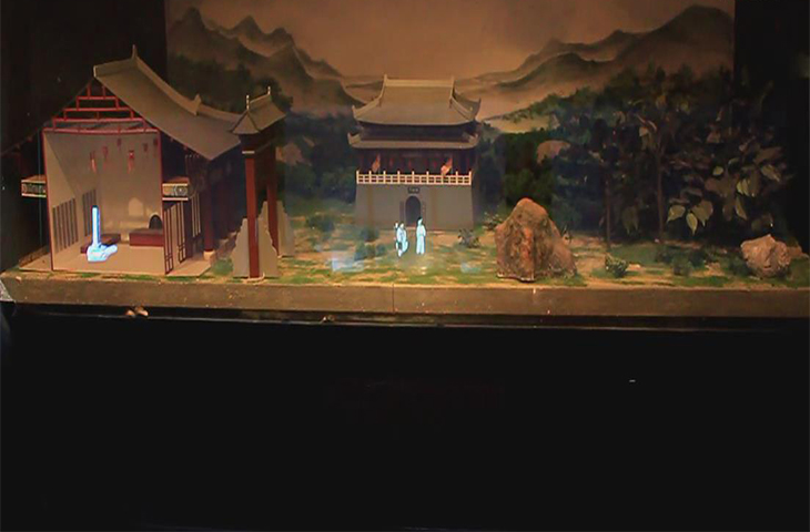 幻影成像是利用45度光學(xué)反射原理實(shí)現(xiàn)懸空立體效果,將所拍攝的影像投射到布景箱中的主體模型景觀中,實(shí)現(xiàn)實(shí)景造型與幻像的結(jié)合,從而完美演繹故事發(fā)展過(guò)程。除此之外,還可以配上三維聲音、燈光、氣味、煙霧等,使其展示效果更加惟妙惟肖。