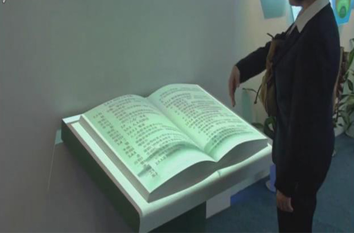 電子翻書:主要是由電子設備和投影技術組成,它不同于空中翻書是飄在空中的,是有實體的書模型,上面是投影機投射下的內容,人在做出翻書動作的同時也會發生脆脆的聲響,就像正在看普通書籍樣。