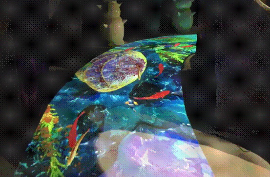 地面互動(dòng)是參與者和地面上影像的真實(shí)互動(dòng),使多名參與者融入場景中,同時(shí)參與游戲。當(dāng)你踏入投影機(jī)投射在地面上的影像時(shí),你可以直接使用雙腳在地面投影幕上的虛擬場景進(jìn)行互動(dòng),然而互動(dòng)效果就會(huì)隨著你的腳步產(chǎn)生相應(yīng)的變化。