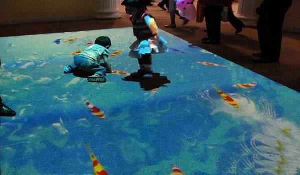 1、互動(dòng)魚池:水池是投影畫面,顯示出的影像是魚在水中游動(dòng),當(dāng)人們從投影區(qū)域內(nèi)走過時(shí),水面會(huì)出現(xiàn)水波紋的 效果,而且魚兒也會(huì)及時(shí)的避開。