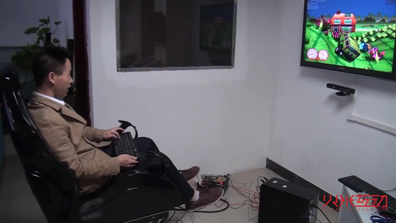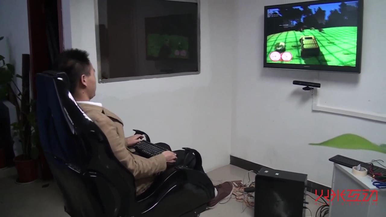 視頻中展示的是4D影院中的動感座椅,根據游戲的故事情節(jié),由計算機控制做出特技效果,可以帶來震動、顛簸等特效。從而調動了認得感知系統(tǒng),使參與者仿佛真的參加了這個游戲,非常驚險刺激,帶來身臨其境的體驗感。