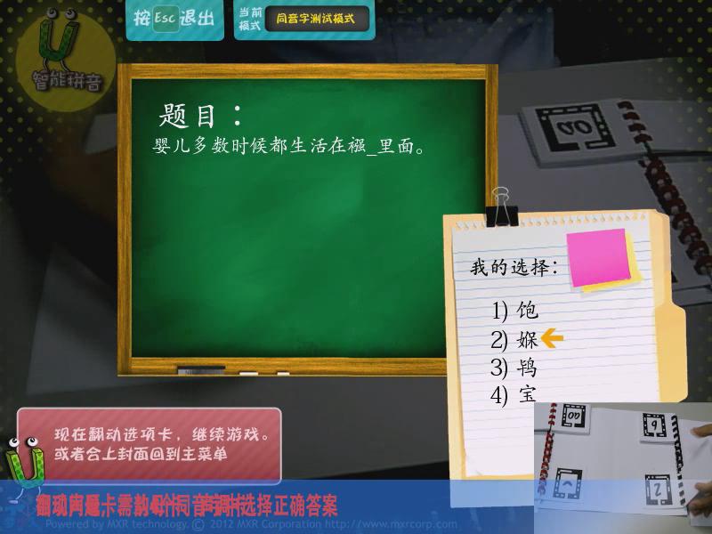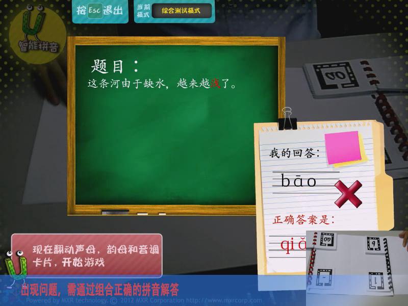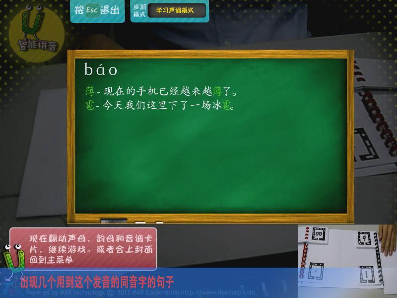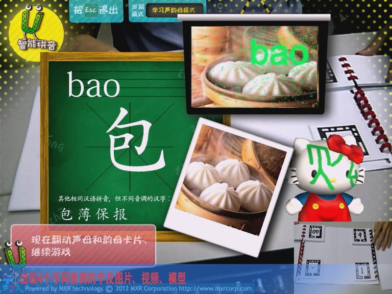 通過AR游戲的形式,讓參與者能夠?qū)W習(xí)拼音,主要分為靴子聲韻母、聲調(diào)、同音字測試、綜合測試四大模式,讓學(xué)習(xí)拼音變得更加有趣。