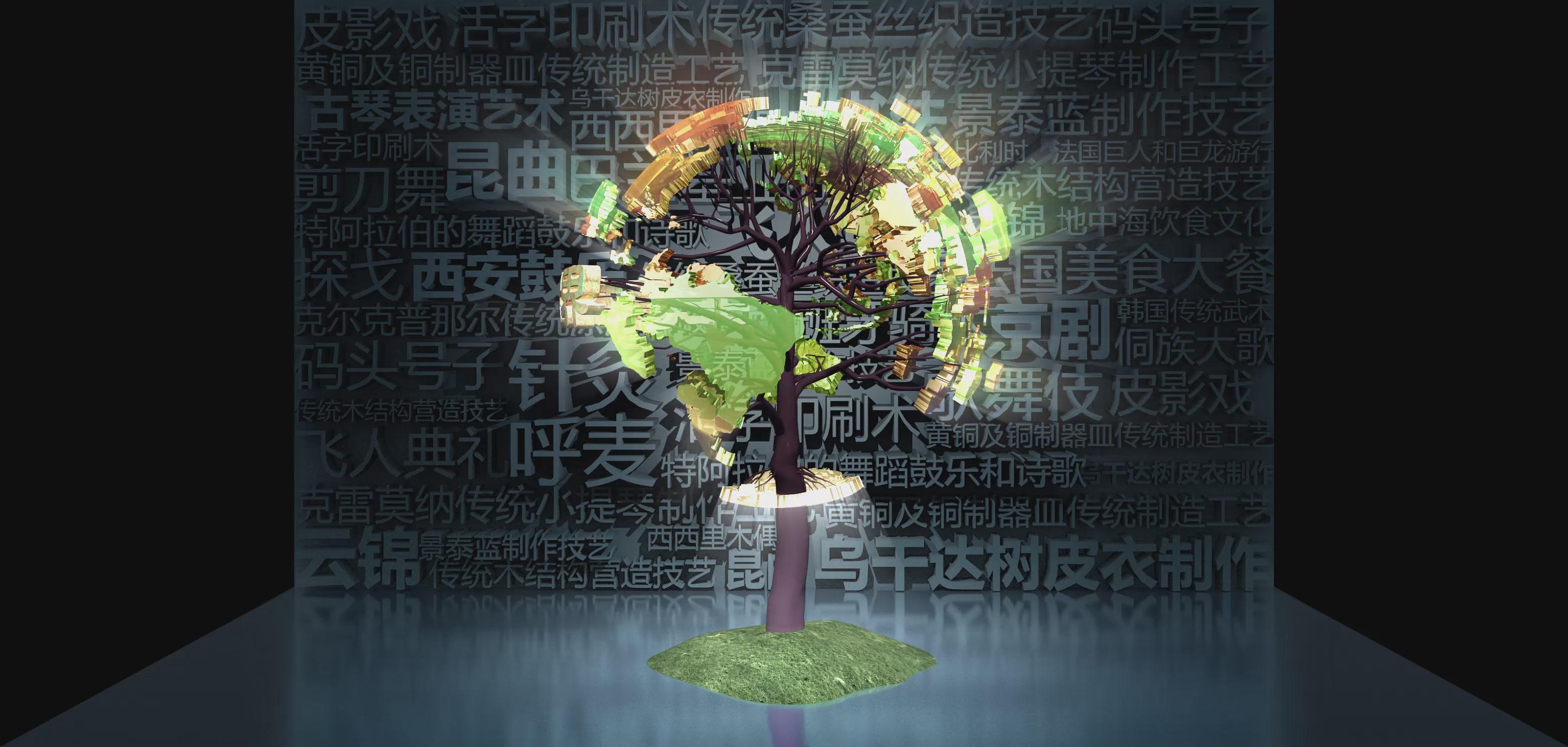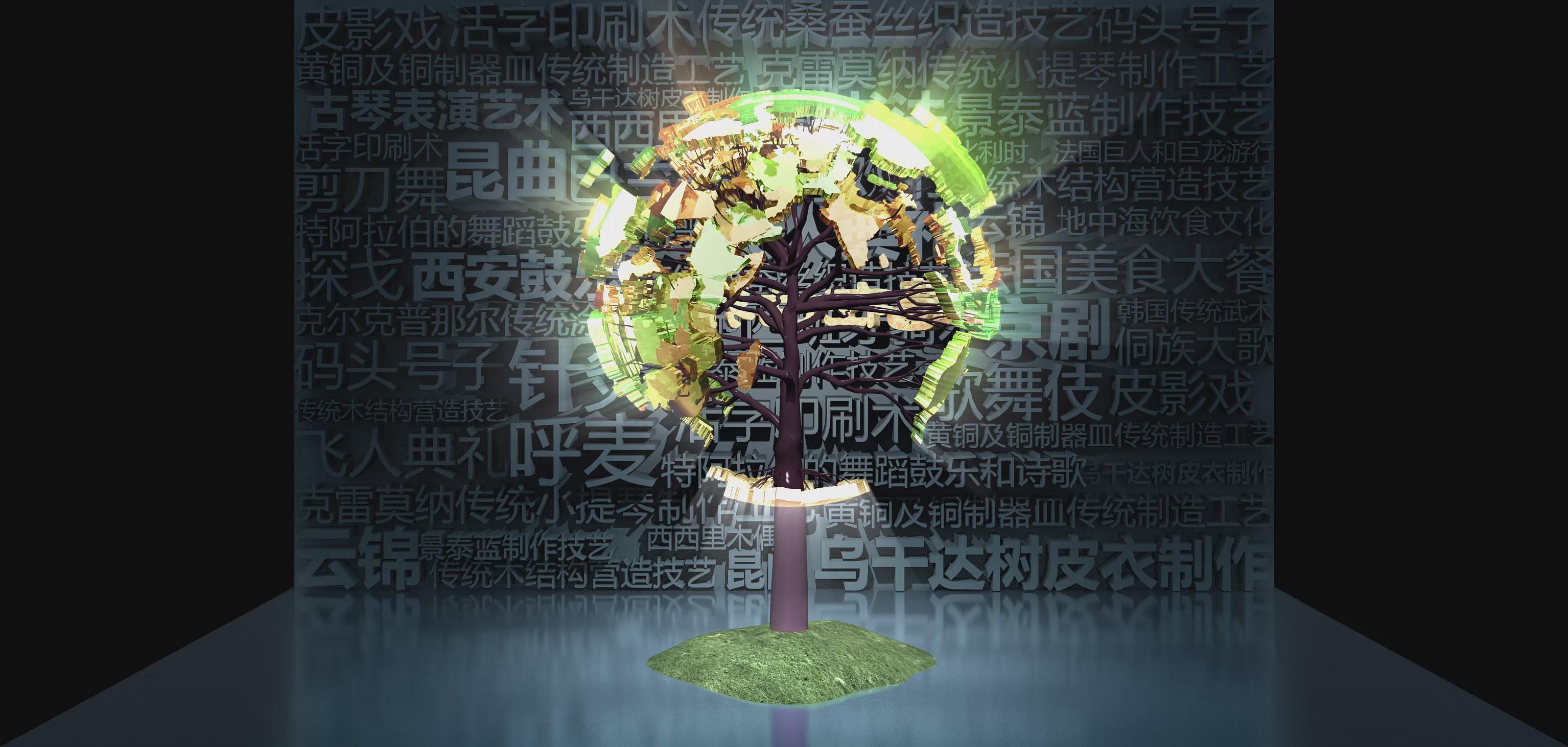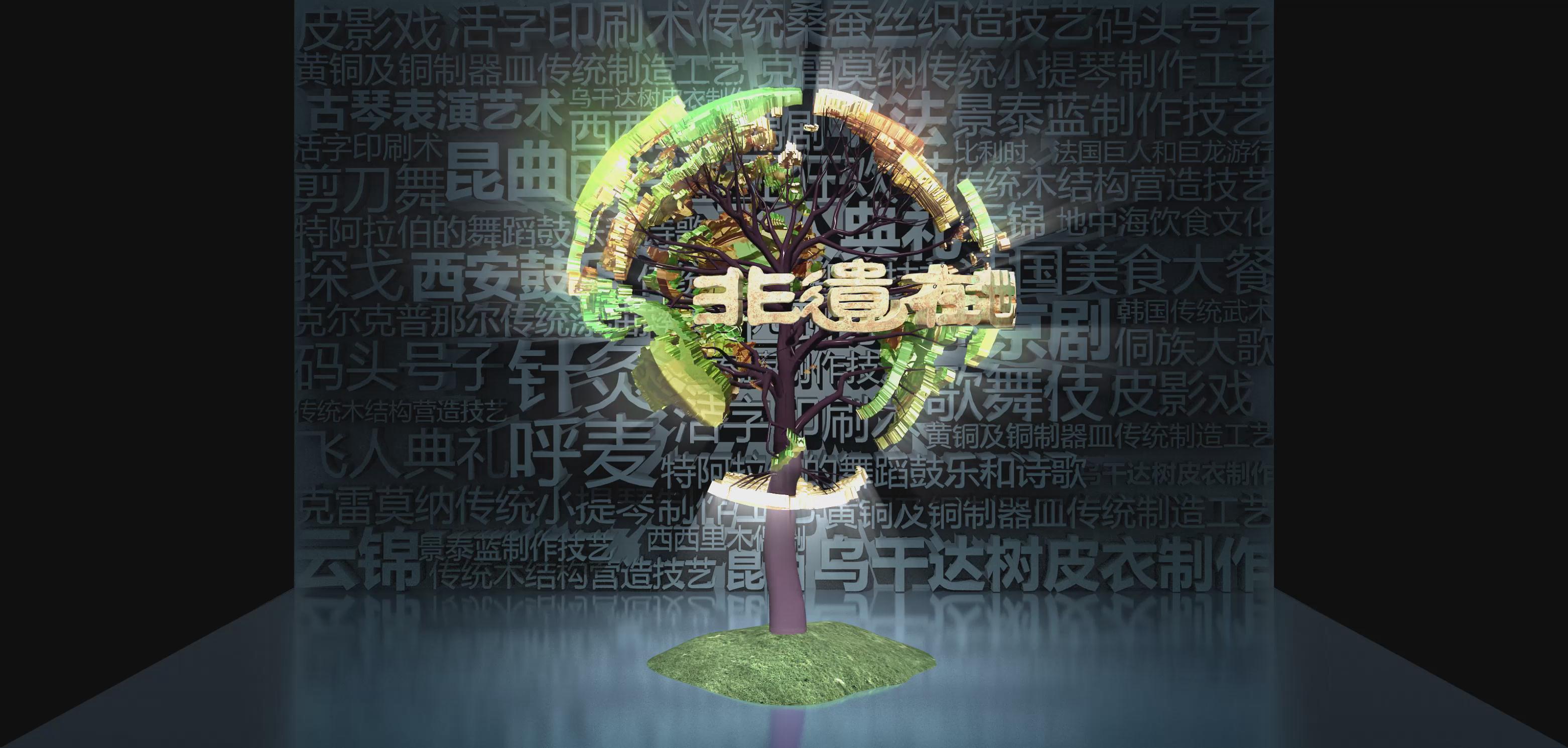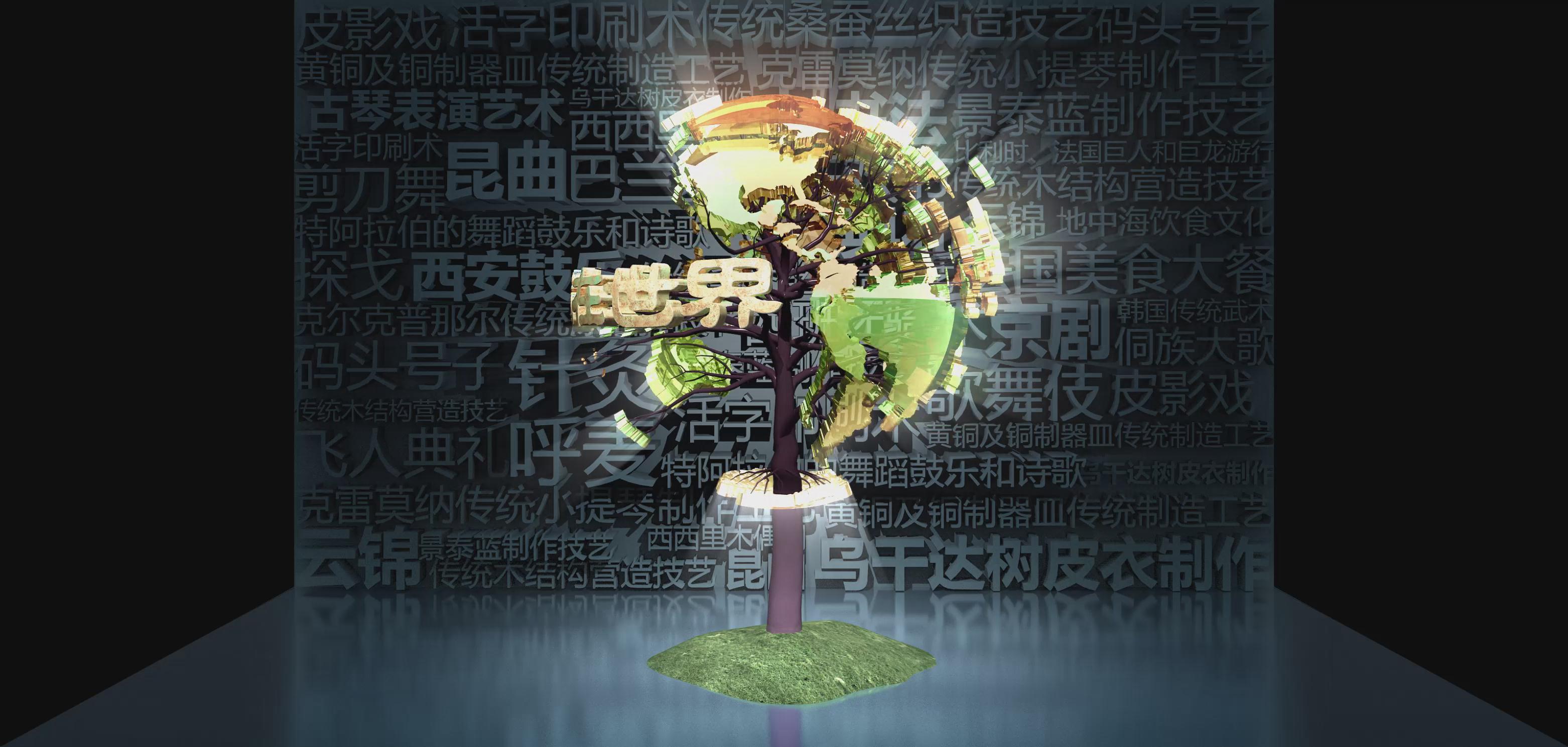 截止2017年6月,中國已有39個項目躋身世界級非物質(zhì)文化遺產(chǎn),項目總數(shù)位居世界第一。其中,人類非物質(zhì)文化遺產(chǎn)代表作名錄31項,急需保護的非物質(zhì)文化遺產(chǎn)名錄7項,非物質(zhì)文化遺產(chǎn)優(yōu)秀實踐名冊1項。 以折幕形式向大眾展示世界非物質(zhì)文化遺產(chǎn),在背景圖中列出了多種非遺事項,結(jié)合立體模板大樹的形式,讓大家可以了解中國的非遺項目。